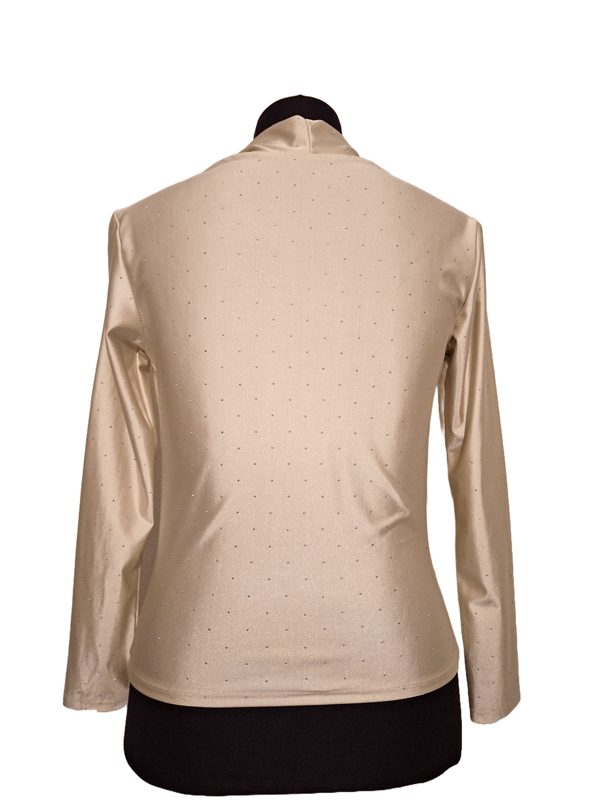 Voeg een vleugje elegantie en subtiele glamour toe aan je outfit met dit beige shirtje. Het shirt is voorzien van een mooie watervalhals, die zorgt voor een zachte, vloeiende look en een flatterende pasvorm. De lange mouwen maken het perfect voor koelere dagen of om stijlvol te combineren met een blazer of vest. Fijn afgewerkt met glinsterende details, geeft dit shirt een subtiele sparkle, ideaal voor zowel casual als feestelijke gelegenheden. Gemaakt van zachte, comfortabele stof die de hele dag heerlijk draagt.